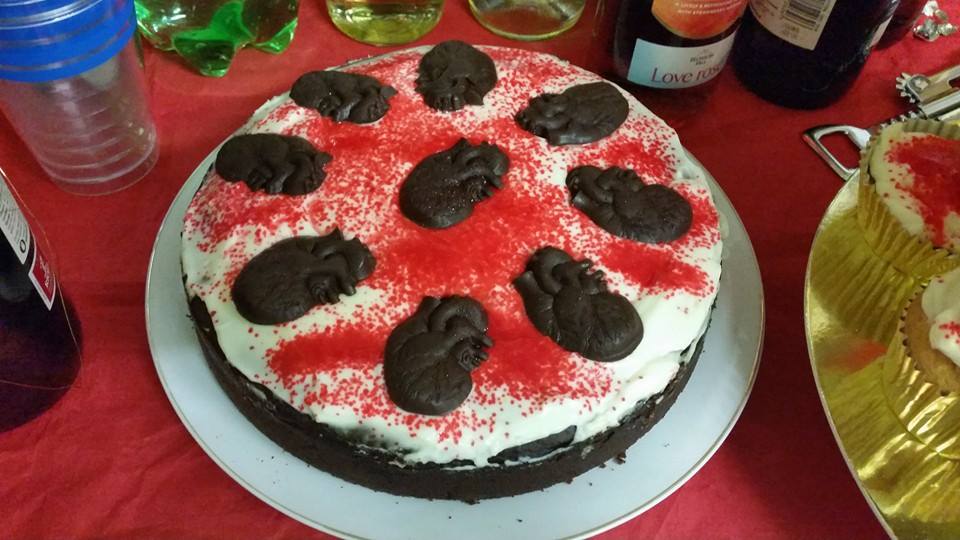 And a chocolate cake with anatomically correct chocolate hearts, and ‘blood’ on snow frosting. Delightful.